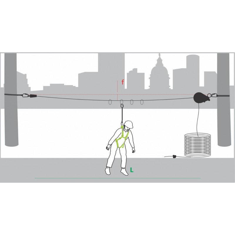 ⚠️ Hinweis: Beim Anbringen der Seilsicherung muss der Durchhang (f) berücksichtigt werden, da dieser zur Sturzhöhe hinzugerechnet wird. Bei voller Länge von 25 m beträgt der Durchhang f = 4,83 m.